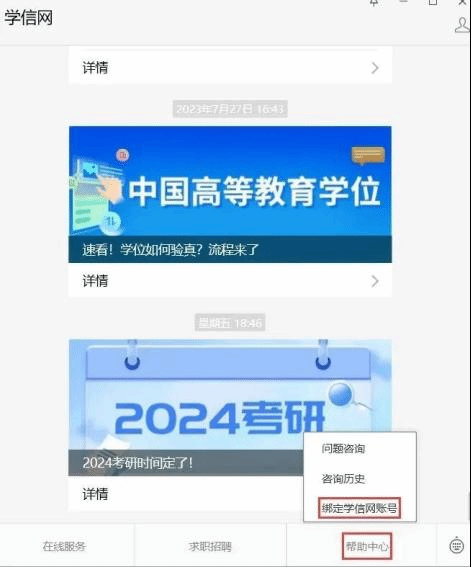 注:已有学信网账号的用户可直接绑定,没有学信网账号的用户,请先注册,然后绑定。